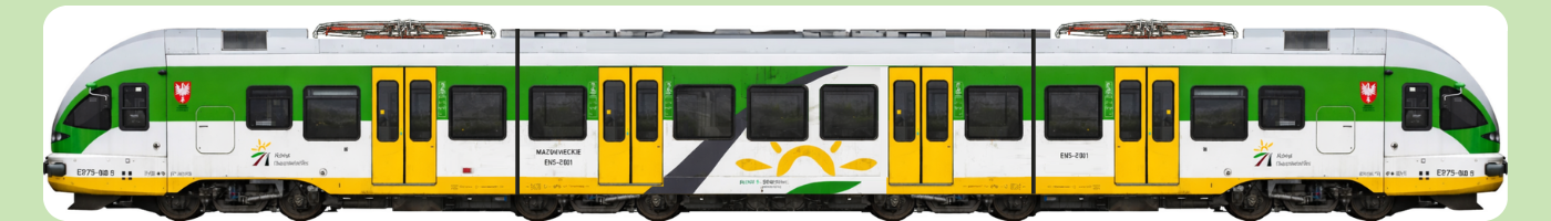 Stadler Flirt ER75 w barwach Kolei Mazowieckich to nowoczesny elektryczny zespół trakcyjny o wysokim standardzie. Posiada eleganckie malowanie w kolorach bieli i zieleni. Pociąg może osiągać prędkość do 160 km/h i oferuje bardzo dobre przyspieszenie. Wnętrze jest klimatyzowane, przestronne i wyposażone w nowoczesne systemy informacji pasażerskiej. Jednostki Flirt są znane z wysokiej niezawodności i komfortu jazdy. Pociąg jest przystosowany do przewozu rowerów oraz osób o ograniczonej mobilności. Kursuje na trasach regionalnych i przyspieszonych w mazowieckim. Duże okna zapewniają dobrą widoczność krajobrazów. Konstrukcja modułowa umożliwia łatwe dostosowanie do potrzeb przewoźnika. Ciekawostką jest, że Flirt jest jednym z najpopularniejszych modeli pociągów regionalnych w europie.